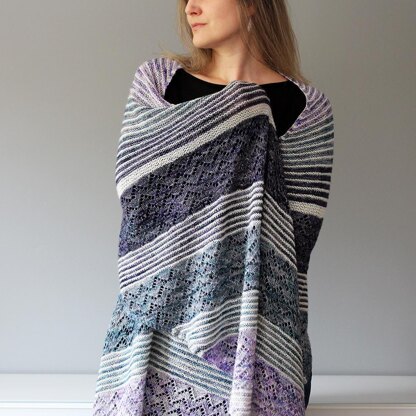 A fascinating interplay of colour fades, garter stripes and lace creates this large and cosy wrap.