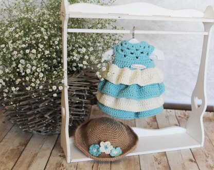 Crochet outfit for a doll pattern in PDF format. It consists of 15 pages accompanied by more than 50 photos. This outfit fits a doll with a height of 12 inches / 30-32 cm. The outfit consists of a dress, a hat decorated with field flowers, shoes, and hair ties.