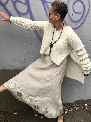 Are you looking for easy knitting project? Yes, you really can knit the “Dressed in White Tunic-Sweater” without a tricky pattern. It is worked in one piece, sideways, using circular needle, starting by knitting a sleeve cuff and ending with the other one. The “Dressed in White Tunic-Sweater” features a neat V neckline, asymmetric hemline, slit sides, dropped shoulders and long sleeves. It is knitted in a Nupp (bobble) and dropped stitch patterns. The sweater needs just minimal seaming, when completed: sleeves and part of sides are seamed, leaving long side splits. SKILL LEVEL: Intermediate. MATERIALS REQUIRED: 9 x 50g balls (1260m or 1377yds) using Drops alpaca boucle 0100 colour shade. NB If you substitute another yarn, please check gauge (tension) and yardage. 1 Circular needle 7.00mm x length 100cm (US -). 1 Tapestry needle.
