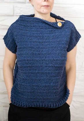 Brooklyn Tweed’s bulky-weight Quarry gives this top a nicely boxy and architectural look. To this, an asymmetrical collar has been added for a unique touch. Working through front and back loops, as well as seaming on the right side of the piece creates great lines too. This wool holds its shape well, while also being very lightweight, so even though this is a heavier wool, it doesn’t feel heavy while wearing the top. The added bonus to working with bulky wool is that it crochets in a flash. Add a pop of colour by choosing some interesting large buttons for the collar .