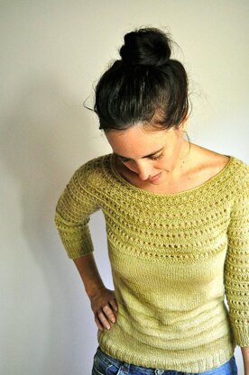 Drift is knit seamlessly from the top down and features a simple yoke construction that is adorned with a pretty eyelet pattern that is continued down through the sleeves. Slight waist shaping adds a flattering fit to the garment which has an overall casual structure that looks great with a pair of jeans or worn over a spring dress. Knit in fingering weight yarn, Drift makes a fabulous transitional piece that can be worn in the spring and autumn months.
