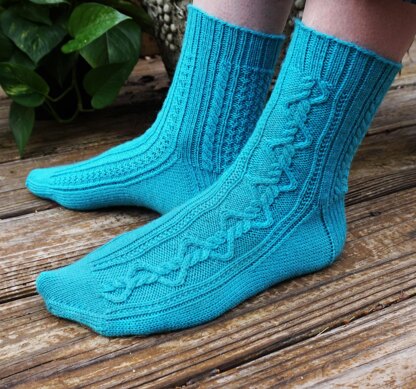The cabled socks are knit from the top down with a heel flap and gusset. Right and left socks are mirror images of each other. Both written instructions and charts are included for the detailed sections of the pattern.