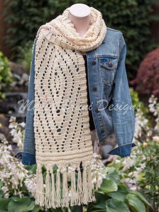 Dundarave Scarf is exquisitely textured by using Double Crochet stitches creating large joining waves with diamond centers. In keeping with the repeat row count, this scarf can be made to any desired length. The width can be adjusted by increasing or decreasing the stitch count. The yarn used is soft to the touch and is easy care.