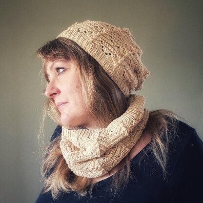 Beanie hat and cowl set with lace work throughout. Perfect for squishing into a beach bag ready to be whipped out when the temperature drops.