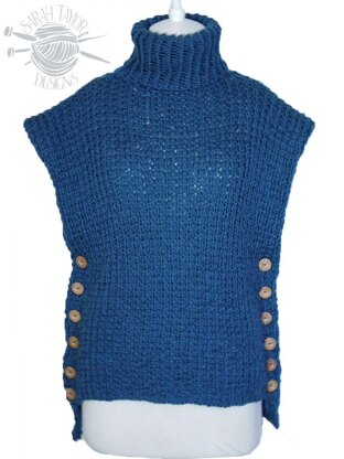 Worked with two strands of light worsted (double knitting/8 ply) yarn and size 13 (9.00 mm) needles, it's quite quick to make. The button-up sides offer the choice to wear it undone as a loose poncho style.