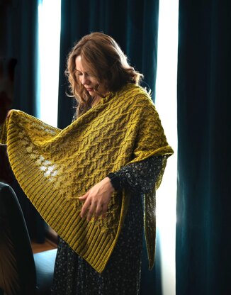 NotesThis shawl is worked flat from the lower left point to the top edge with increases along the right side edge. The wide edge border is worked in 2x2 ribbing.