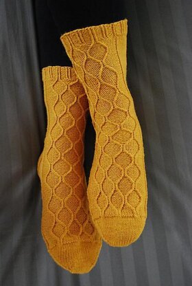 These cuff-down socks feature a traveling twisted stitch pattern on the front of the leg and instep that has both written and charted directions. Graded to three adult sizes, these socks add a bit of fanciness to your average stockinette sock.