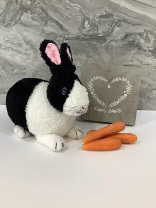 Follow me on Facebook ‘Carol Connelly Knits’ for links to new patterns. This pattern is for a soft and cuddly Dutch Bunny. The Bunny is life size and easy to cuddle, ideal for children over 3 years of age and pet lovers. You will need 3.5 and 4mm needles, a ball of each colour King Cole Truffle yarn and a small amount of pink and black DK yarn for the inner ears and the face/paw detail. Also toy stuffing, a pair of 18mm blue glitter safety eyes and a little black sewing thread and PVA glue for the whiskers. The Bunny measures approximately 28cm long, 22cm high and 18cm wide.