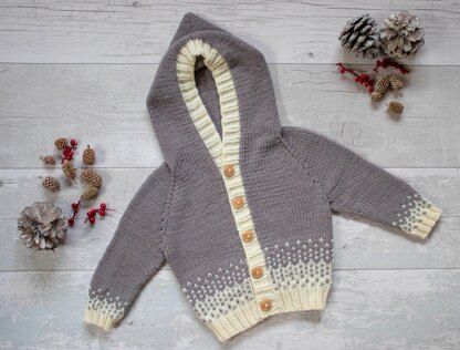 This sweet cardigan is worked in one piece from the top down with raglan shaping for the sleeves and is completely seamless. Starts with provisional cast on, from which the hood is worked up. The body and hood are worked flat and the sleeves are worked in the round.