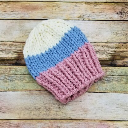 The Dysartsville Baby Hat knitting pattern is so quick and so easy to knit, featuring 3 colors of super bulky yarn and 1 x 1 ribbing. Knitting the Dysartsville baby hat is a great way to use up those little balls of scrap yarn and so fun to put color combinations together!