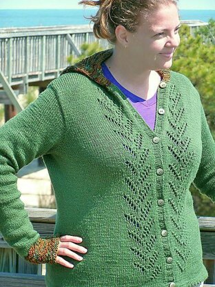 This cardigan is the perfect sweater for those upcoming crisp fall nights! It is a top-down, one-seam cardigan with lace panels down each side of the buttonbands. It features waist-shaping and set-in sleeves. The sleeves are knit from the arm-hole down and every row is clearly written for frustration-free knitting. The cuffs and hood are a complementary lace, and the cuffs double as fingerless mitts! A folded, picot-edged hem finishes the look. Please note that due to the fitted wrists on this sweater, it will be best to wear with a short-sleeve or tank top.