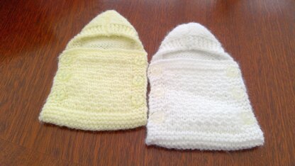 Small hooded sleeping bag for early gestation babies born asleep. Can be knitted in 3 or 4 ply