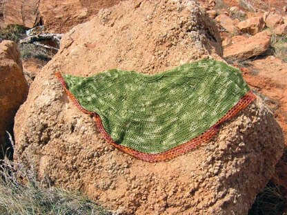The fan shape of this shawl is inspired by the weapons of the Kyoshi warriors. The pattern includes a chart for leaf motifs sprinkled throughout the shawl.