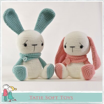 With this pattern you can crochet a lovely set of bunnies one with straight ears, and the other is with floppy ears. Plus the scarves they are wearing.