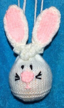 This knitting pattern is for a festive drawstring gift bag in the shape of a bunny.