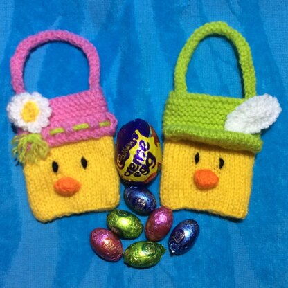 This knitting pattern is for two gift bags as a girl and boy Easter chick.