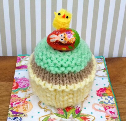 Straight needles and leftover oddments of DK yarn are used + a tiny fluffy chick decoration.