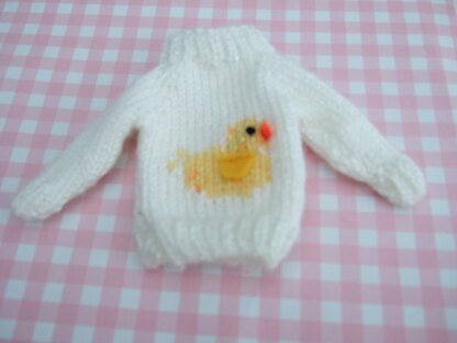 This is an Easter themed mini jumper. The jumper is knitted in the flat, and consists of a front , back, 2x sleeves and a ribbed neck which make up this pattern. It is knitted on 2mm needles using double knit wool. This pattern is for the white chick jumper and the white bunny jumper. The chick one is knitted in double knit wool and the bunny one is knitted in cotton double knit. Both patterns are slightly different to accommodate the design. As you can see from the photo you can knit these in other colour combinations. You can knit this project on bigger needles but the size will be larger. The wool I've used is King Cole Gitz, James C Brett Twinkle and Drops Safron all dk.. The size of the jumper is one size . Length 3.5" and Width 2.5". They knit up fairly quickly. Tiny amounts of felt are required for the chick's wing and beak and the bunnies ears. These are sewn on after the jumper is knitted. A great idea to hang on an Easter tree.
