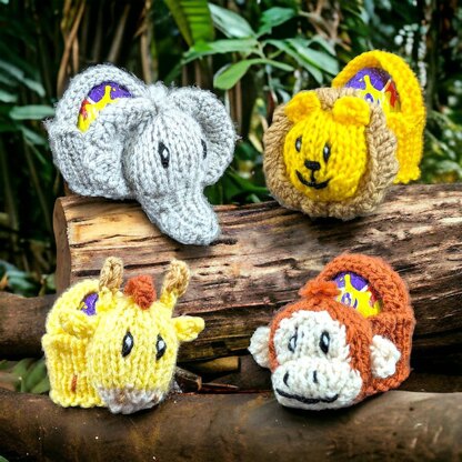 This knitting pattern is for a Easter Zoo Animals basket bags to hold eggs. The set includes how to make a lion, elephant, giraffe and monkey.