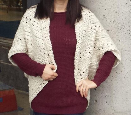 A super quick and easy shrug to crochet just in time for cool weather! Featuring crochet cable stitch that is easy to master, alternating with rows of double crochet. Designed with very simple one - piece shape, with minimal sewing. Complemented with pretty cross stitch double crochet edging. This shrug is designed to be made with worsted weight yarn, such as Patons Canadiana Yarn, approximately 1100 to 1200 yards, with crochet hook J (6.00 mm).