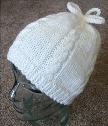 An easy beginner type cable hat, but it fits so well! Everyone will want one, as they work up quickly! Men can wear this too, just leave off the top loops. Uses worsted weight yarn, and 1 pair US # 9 needles. Worked on two needles, in case you do not like double points. This is a good pattern for every knitters library! Make these in bright colors for children, and tweed colors for adults. Or chose your own color combination, and work the ribbing band in a different color to use up even more yarns! This is as fun as it is easy!