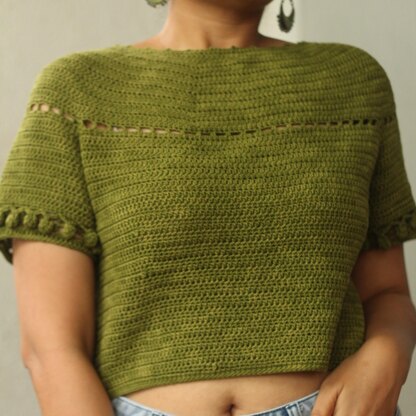 There are two versions of the top - 1. Crop top 2. Regular length top. The pattern is written for Sizes: S-M-L-XL-2XL-3XL. It works up real quick and the pattern is quite easy to follow.