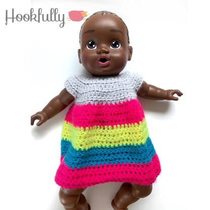 This crochet pattern will help you to create an easy baby doll dress. The doll dress crochet pattern is easy skill level and is designed to fit 14" baby dolls. The doll dress is made in one piece and only requires sewing for a single button. You can make the dress in the color block rainbow design or as a solid color. You will need to know basic crochet stitches and how to increase and decrease. The doll dress crochet pattern is written in USA terminology. The pattern is 4 pages long and includes progress photos, gauge instructions and measurements.