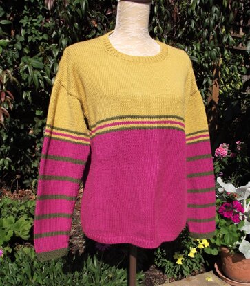 A super, easy knit, easy fit sweater. The design uses only stocking stitch, garter stitch and single rib. The back and front have some gentle shaping to give added width to the design.