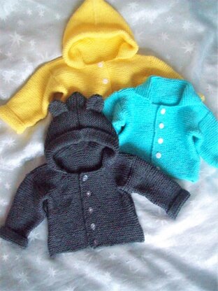 This is a beginners Knitting Pattern with easy to follow, step by step instructions on how to make Jackets for boys or girls, with choice of Hood or Collar. There are no sts to pick up for button bands and neckline, making this a perfect starter project for a beginner.