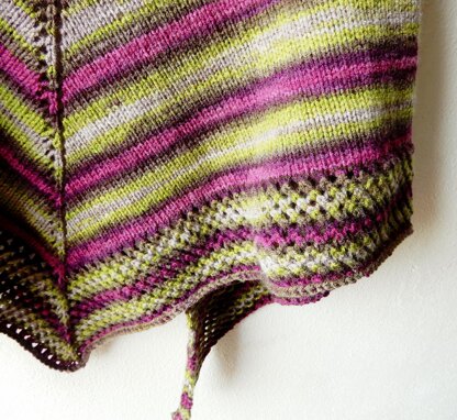 Difficulty level: easy (knit and purl, easy lace stitches, basic top down shawl construction)