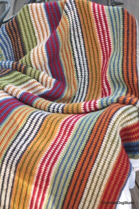 afghan stripe blanket You can crochet your own Yikes, Stripes blanket. It is a wonderful blanket reminiscent of a favorite sweater. The stripes are fabulous and fun. The quality yarn is soft and warm. The crochet afghan has no holes like a granny square blanket that will let in air. This blanket is designed by me in my Tulsa, Oklahoma Studio. While I may sell the pattern multiple times. I only sell the blanket that I create once. The Yikes Stripes blanket is bordered with a lovely soft green and blue border. This blanket is a great gift. This pattern is great beginner pattern. This afghan when completed will be 43" x 80" long. The stripes run lengthwise or head to toe. Skills Needed • single crochet • half double crochet • chain • weave in colors • change colors • tie off and end colors Supplies Needed • Size J or 4 crochet hook • Large eye needle • Scissors • Yarn