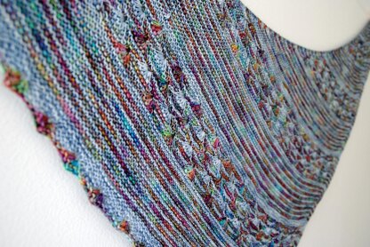Echo Azure is a study on the interplay between variegated and solid yarns. Named after a butterfly with frosty, iridescent wings, the shawl is made of garter stitch, stripes, and shell stitches formed with knit-below stitches.