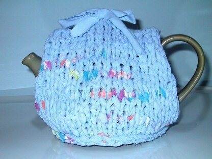Made from one recycled tee shirt. While it is stretchy, you can use a larger tee shirt (medium women's size was used) for a larger teapot.