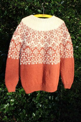 Egil (child) is worked from the bottom edge and up with a 2-colored pattern. The sweater has a circular yoke and sleeve construction.