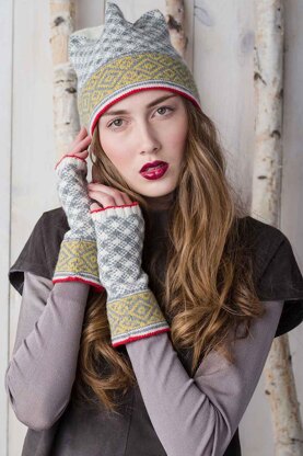 The lighthearted Egret Hat and Mitts Set combines classic stranded colorwork with traditional Sanquhar two-color patterning. The hat is a classic ski-slope shape from the 1950s, and the mitts feature time-honored colorwork in a modern design. Both include lined edges in holiday red, and the hat sports a whimsical tassel to match. This set cries out for a slick toboggan hill or a frozen pond.