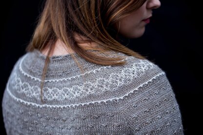 “Eilean” (Gaelic for island) is a top-down seamless sweater, combining the best of yoke and raglan construction for an ultimate fit. Its slightly bell-shaped sleeves are comfortably wide, but not in the way, and the all-over texture makes this garment an entertaining knit. With a small amount of simple fair isle knitting on the yoke – just enough to be decorative, but not as much as to be intimidatingly complicated – it is a good project to get acquainted with colorwork in the round. “Eilean” sweater is knit in our “Delicious” yarn – a gorgeous blend of baby alpaca, silk and cashmere that is pleasant to work with, and equally pleasant to wear.