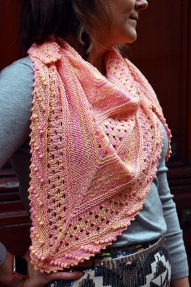 Elara is the eighth-largest moon of Jupiter. This design reflects the moon’s shape through purl stitches, eyelets, and bobbles. This shawl has a triangle shape, but feels elegant with the alternating textures and bobbles. This is a nice size for warmth while eyelets still showing off the outfit beneath, making this a choice project for a special event or to go with a favorite occasion dress.