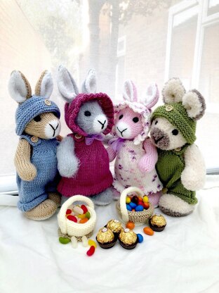 Elderberry Bunny measures approximately 10 inches/28 cms from foot to top of the head, not including ears. The feet, legs and body are knitted in one piece. Head, ears, arms and tail are knitted separately and sewn on. All pieces are knitted flat and assembled, assembly guide is included. Pattern directions include: Elderberry Bunny; dress; bonnet; dungarees; hat and basket.