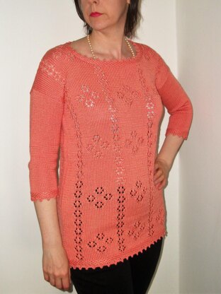 A beautiful long line tunic-sweater with an eyelet lace "medallion" pattern and interspaced with vertical lines of single lace motifs. An easy lace pattern to work as all the wrong side rows are Purl. The borders are in a slip stitch pattern and edged with a pretty picot.