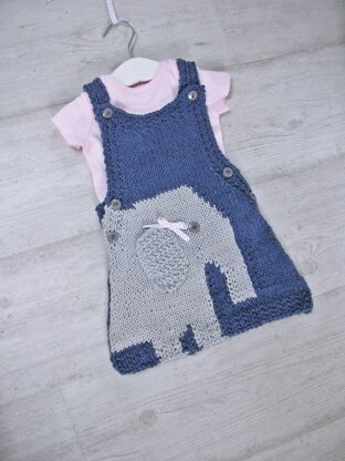 This cosy, knitted pinafore has a fun intarsia elephant motif worked into the front panel. The bib style top fastens with 2 buttons on straps and 2 on each side at waist for ease of fit. A ribbed waistband gives a closer fit across back and over nappy.