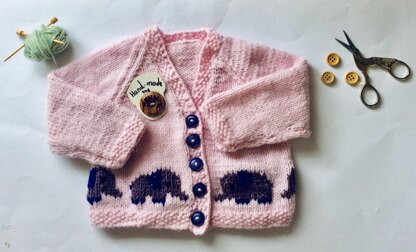 V necked cardigan which is worked in one piece to the armholes. Elephants are worked across the bottom edge. A chart is included for these.