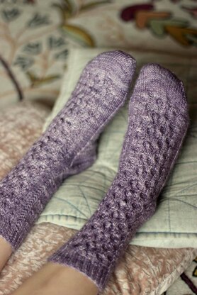 Of course, they’re Eliza socks. Including rich quilting and cables for lush texture and a nod to deep-winter knitting traditions, and happy bobbles for … well, pure joy, Eliza socks are as delicious to wear as they are to knit.