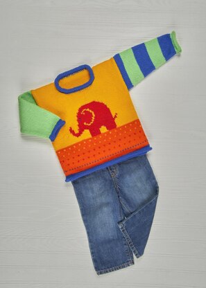 Ellery the Elephant is the second in the series of animal motif pullovers. Bold colors abound in this charming pullover. The design proves that the elements don’t have to “match” to create a great pullover full of life. One drop shoulder sleeve is solid while the other is striped. The design is perfect for using up your stash. Duplicate stitch details enhance the design. Simply knit in stockinette stitch, lower front/back “dots” of color are worked in stranded technique while the motif is worked in intarsia following a chart. This is a multi-sized pattern is designed to fit child 2 through 8 years.