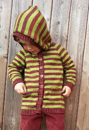 Elmi is a cardigan with raglan-yoke, worked from top to bottom and pick up stitches to knit the neckband and the button bands. You have the choice of a simple neckband and a hood and you can add pockets, if you want.