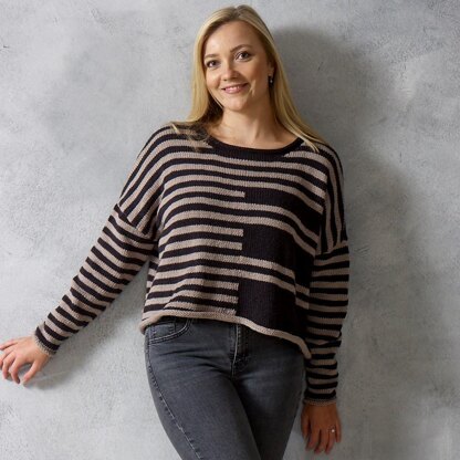 Elodie is a short, oversized sweater. It is knitted in stocking stitch and features a striped pattern.