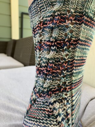 Columns of cables and eyelets accent the back of the leg and then split for the heel increases. Meanwhile, an eyelet column on the front of the leg becomes a lace pattern for the instep.
