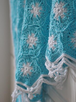 I know the cold never bothered her anyway, but if Queen Elsa ever felt a little chill she might want to snuggle under this snowflake coverlet, made with hexagon motifs arranged in a snowfall pattern with yarn that has a little sparkle! The top and the bottom edges are inspired by frozen icicles and the turquoise and white colour way fits in with the Queen's own colour scheme.