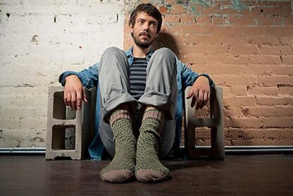 Men's sock pattern with a finished measurement of 7 (8¼, 9½) in / 18 (21, 24) cm foot circumference and 10 (11, 11½) in / 25.5 (28, 29) cm long from back of heel to tip of toe. Socks shown measure 8¼ in / 21 cm. * Gauge 34 sts and 40 rnds = 4 in / 10 cm in mosaic pattern. * Skill level Knit, purl, working in the round and flat, short-row heel, simple increases and decreases, and finishing. * Yarn Spud & Chloë Fine (80% wool, 20% silk; 248 yds / 227 m / 65 g) #7814 shitake (light brown; MC) and #7818 green bean (CC), 1 skein each. * Needles and Notions 2.75 mm (US2) set of 5 double-pointed needles. Adjust needle size if necessary to obtain the correct gauge. Markers and tapestry needle.