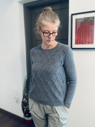 Elva is a classic set-in sleeves sweater, worked in four pieces: a front, a back and two identical sleeves. All the pieces are worked flat from the bottom edge up to the neck. Pieces are seamed together at the end, then the neckband is picked up.