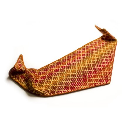 This shawl is deceptively simple, knit in garter stitch with simple slipped stitches to create garter stitch mosaic knitting. Only one shade of yarn is used per row as the pattern is made from knitting stripes and slipping occasional stitches.